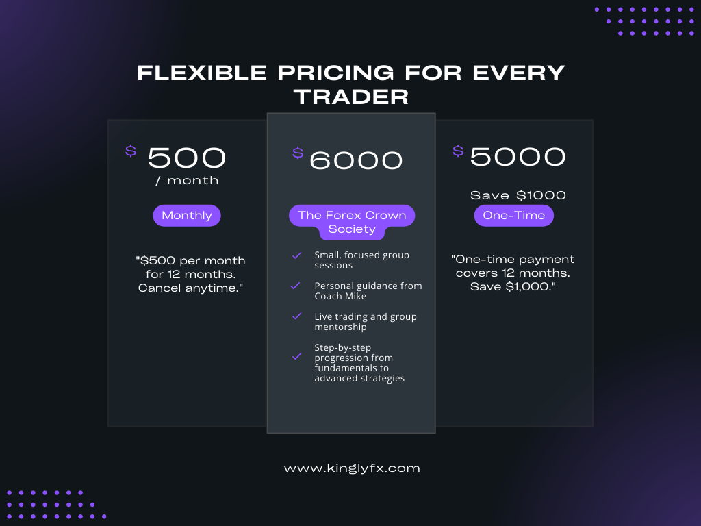 A: The Forex Crown Society is a comprehensive 12-month program designed to take you from the basics of forex trading to live trading and consistent profitability. During the program, you'll go through multiple phases, including a weekend Bootcamp, technical analysis, strategy development, and live group trading sessions. King’s Council also offers a 12-month membership that includes weekly live trading sessions, mentorship, and advanced trading insights.